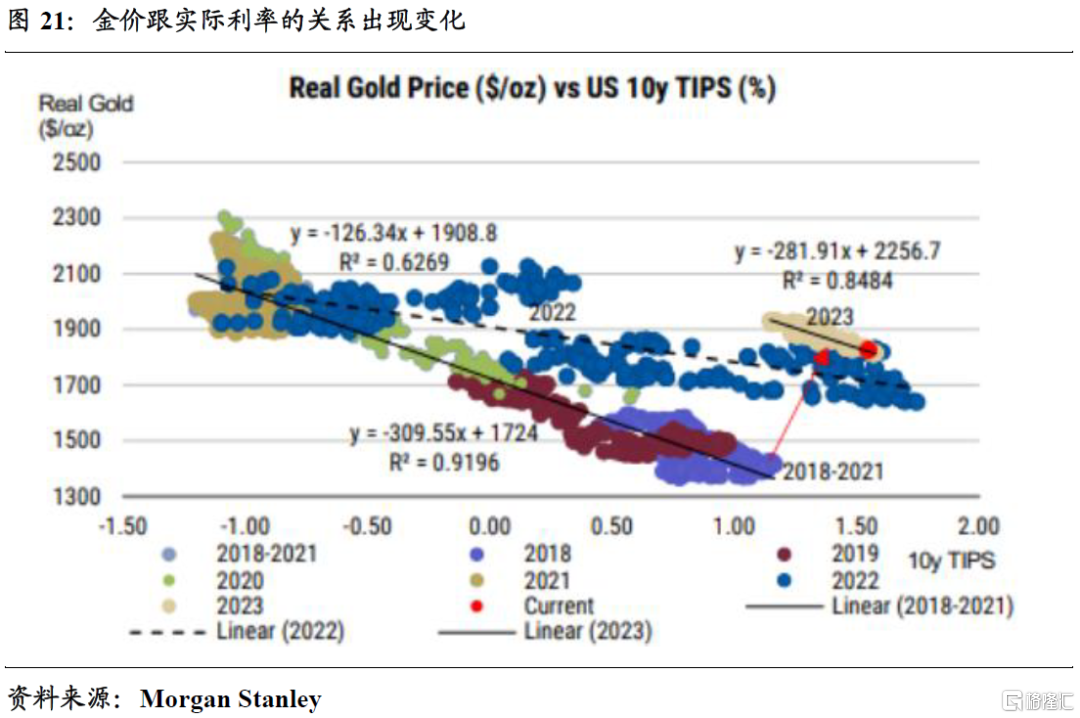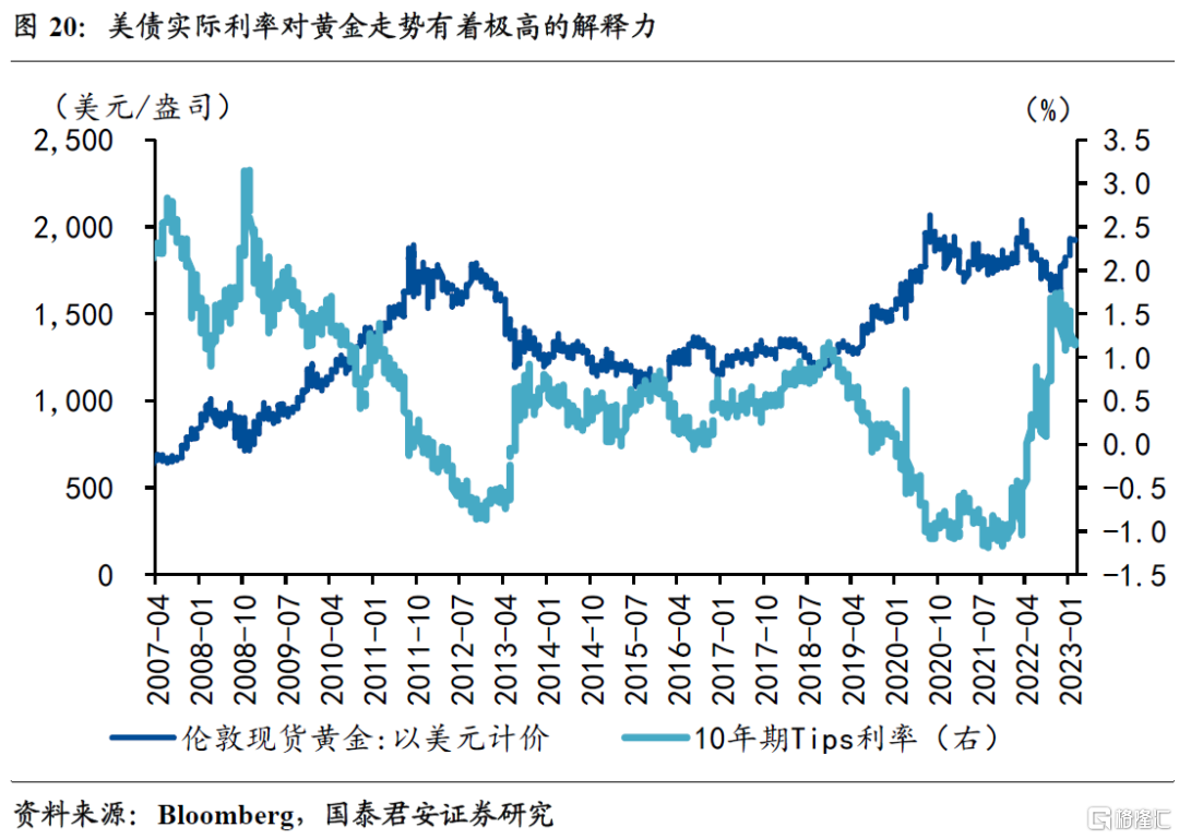 虽然说近期金价跟实际利率的走势方向依然同步,但二者的弹性演绎明显有背离。以2022年前3季度为例,尽管实际利率大幅上行,但金价仅仅从2079美元/盎司回落到1620美元/盎司,按照以往规律“理应”回落到1300美元/盎司。2022年4季度以来,尽管实际利率下行幅度不大,但金价已经反弹到历史高位,意味着金价与实际利率的关系可能在酝酿“新变化”。