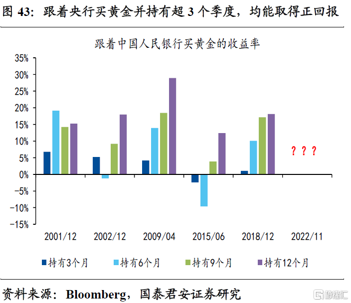 时至当下,主流央行加大购买黄金,也是黄金超主权货币属性彰显的一个缩影。以中国人民银行为例,人民银行分别在2001年12月、2002年12月、2009年4月、2015年6月、2018年12月进行了5轮增持黄金的操作。如果跟随人民银行买入黄金并持有3个季度,收益率全部为正,且平均收益率达到12.6%。如果跟随人民银行买入黄金并持有4个季度,收益率同样全部为正,且平均收益率达到18.5%。此外,加密货币等其他超主权资产会不会同样受益于此,也值得期待。