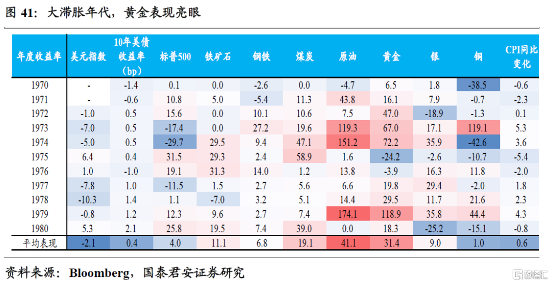 二战后建立的布雷顿森林体系,其固有的“特里芬难题”始终成为威胁货币体系的不稳定因素,最终导致1971年美元与黄金脱钩。20世纪60年代末,滞胀阴影下的美国出口竞争力逐步被日本、德国所取代,70年代初美国从贸易顺差国变为贸易逆差国,最终导致美元与黄金脱钩。再结合大通胀背景来看,1970年代黄金的配置属性再次彰显。