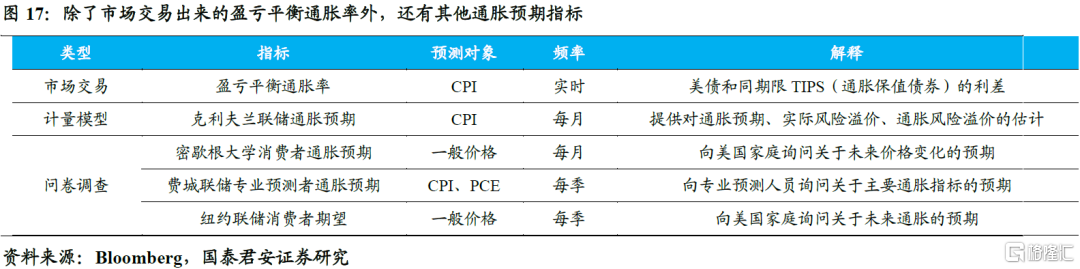 这里的通胀预期,其实并不是美联储的通胀预期,也不是市场交易出来的通胀预期。除了市场交易出来的盈亏平衡通胀率外,通过计量模型得到的克利夫兰联储通胀预期,以及通过问卷调查得到的密歇根大学消费者通胀预期、费城联储专业预测者通胀预期(SPF)等,也常常被用于反映通胀预期的走势,但对市场交易的落地运用较弱。