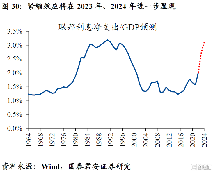 通胀与利率并非简单的因果关系,高通胀也是高利率的解药。我们在前期测算显示,2023、2024年美国联邦财政净付息额/GDP极有可能达到历史最高的3%。换言之,从联邦财政的角度来看,5%以上的政策利率并非能轻易忍受的位置,也是美联储理论上可以“暂停观察”紧缩效应逐步显现的位置。对于美国政府而言,只要名义经济增速,这意味着实际增长乏力的背景下,适宜的通胀中枢抬升,有利于缓释债务压力,即用时间换空间。对于美联储而言,尽管口头上依旧强调2%的通胀目标不变,但不排除内部已重新讨论通胀目标且未来正式修改的可能。