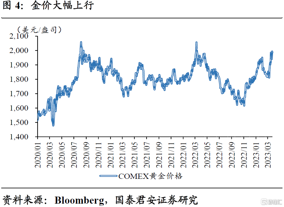 近期避险情绪升温下,金价再度突破2000美元/盎司。伴随美欧银行风险事件的暴露,美股、原油等风险资产,VIX指数有所上行,金价大幅上涨。眼看金价逼近历史高位,部分观点认为避险升温透支了贵金属行情,后续调整在即。也有观点认为,如果爆发深度危机,贵金属也难逃一跌。