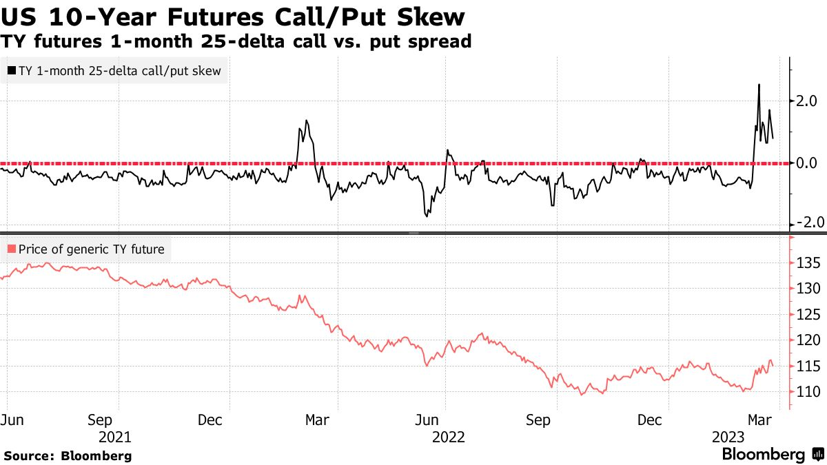 有迹象表明,交易员正在加大投资,以对冲美债收益率进一步下跌的风险,10年期美债期货的期权倾斜仍为正值。这表明,由于10年期美债利率从几周前的4%降至3.5%附近,其看涨期权受到市场青睐。这一偏差已脱离两周前触及的最极端水平,表明交易商为防范美债涨势而支付的溢价略低。