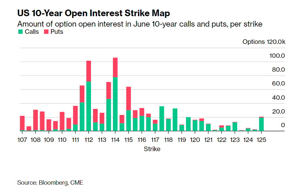 在6月的10年期美债期权中,看涨期权行权价在112.00和114.00区间的未平仓头寸仍处于高位,表明从3月14日开始进入6月23日的10年期112.00/114.00看涨期权利差押注的6000万美元多头头寸仍未平仓。