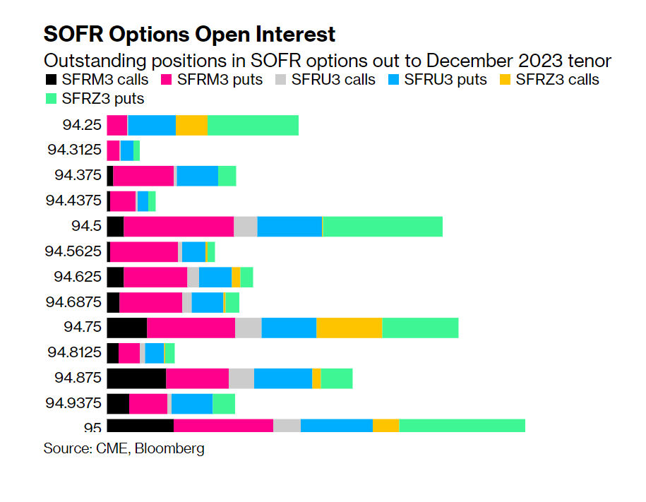 12月23日到期的SOFR相关的期权,在94.25至95.50区间内未平仓合约仍处于高位。最近突出的流动包括6月23日到期的65000份SOFR 95.75/95.50/95.25/95.00看跌合约,以及6月23日到期的24000份SOFR 95.1875/95.4375/95.6875看涨合约。