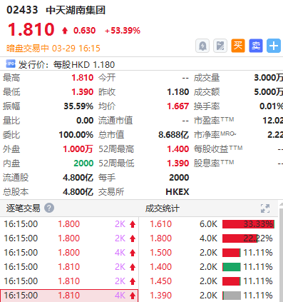 华盛资讯3月29日讯,总承包建筑商中天湖南集团暗盘现涨53.39%,一手账面浮盈1260港元,最新总市值8.688亿港元,该股预计将于本周四正式港股挂牌上市。