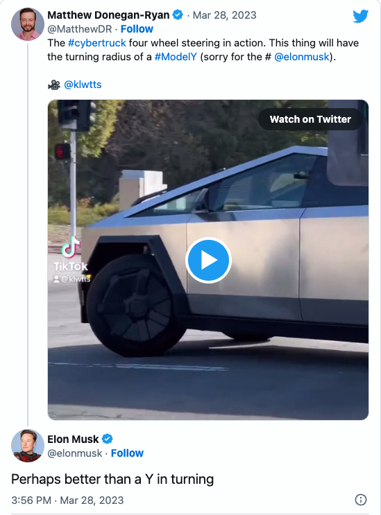 日前,海外社交媒体用户分享了一段特斯拉测试Cybertruck原型车转向的视频。视频显示它掉头、启动、摇晃以测试其转向的稳定性,最后再急转弯。根据Electrek的说法,这款电动皮卡很可能采用后轮或四轮转向,使后轴的转向比前轮更小,从而实现更紧凑、更精确的转弯半径。马斯克表示,Cybertruck的转向可能比Model Y更好。