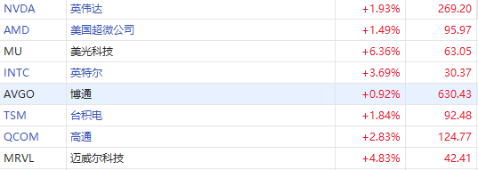 美光科技绩后涨超6%,领涨半导体板块,公司称内存市场已触底库存余额在上一季度已达峰值。英特尔涨超3%,高通涨超2%,英伟达、美国超微公司、台积电涨超1%。