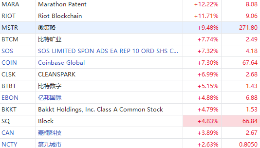 区块链概念股集体大升,Riot Blockchain $MARA 涨超11%、微策略 $MSTR 涨超9%,Coinbase $COIN 、比特矿业 $BTCM 涨超7%,比特数字 $BTBT 涨超5%,亿邦国际 $EBON 、Block $SQ 涨超4%,嘉楠科技 $CAN 涨超3%。