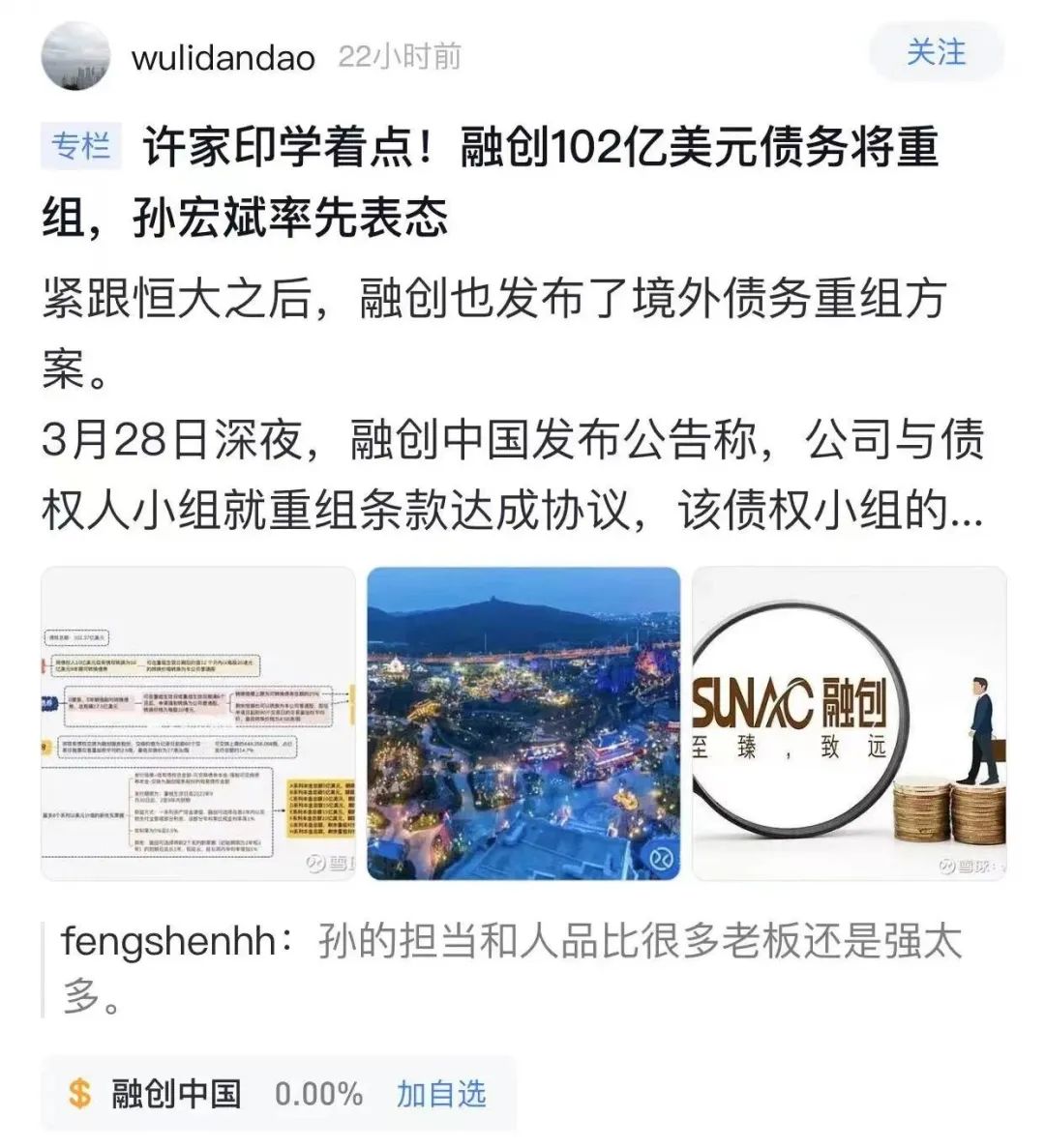团队积极响应,老孙也全力支持,把2021年他借给融创的4.5亿美元无息股东借款,与债权人以相同价格转股,并且受偿顺序还排在债权人之后。