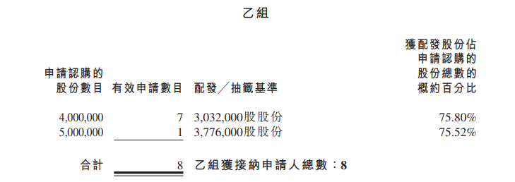 中宝新材申购一手中签率100%,乙组共8人,乙头获配1516手。