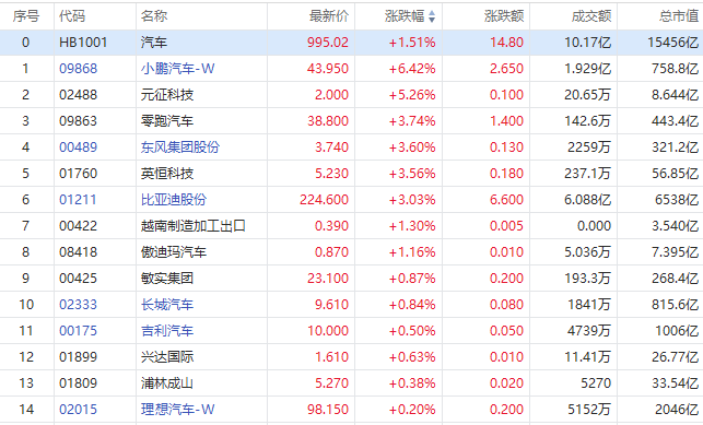 华盛资讯3月30日消息,港股汽车股走强。截至发稿,小鹏汽车-W涨6.42%报43.95港元每股,成交额1.929亿港元;零跑汽车、东风集团股份涨超3%,比亚迪股份涨3.03%报224.6港元每股,成交额6亿港元;长城汽车、吉利汽车跟涨,理想汽车微涨0.2%。