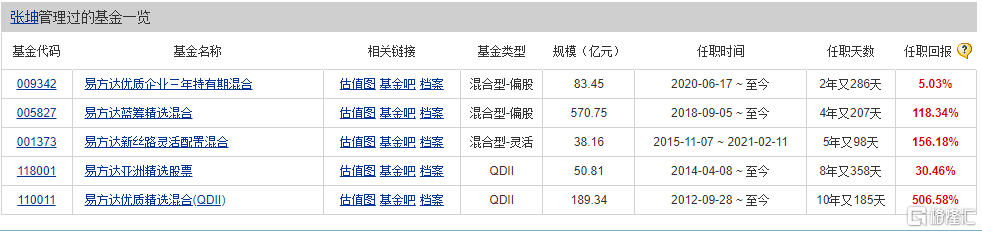 目前,张坤共管理4只基金,分别为易方达优质企业三年持有期混合、易方达蓝筹精选混合、易方达亚洲精选股票、易方达优质精选混合(QDII)。现任基金资产总规模894.34亿元,目前在主动权益基金管理规模排名第二。