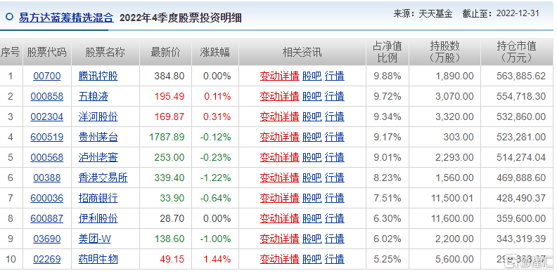 不过值得关注的是,2022年年报显示,易方达蓝筹精选排名第11至第20名的隐形重仓股中,相较2022年中报,海吉亚医疗的持股数量大幅增加223.64%,中国海洋石油、李宁、爱尔眼科持股数量同样出现增加,而分众传媒遭到大幅减持。