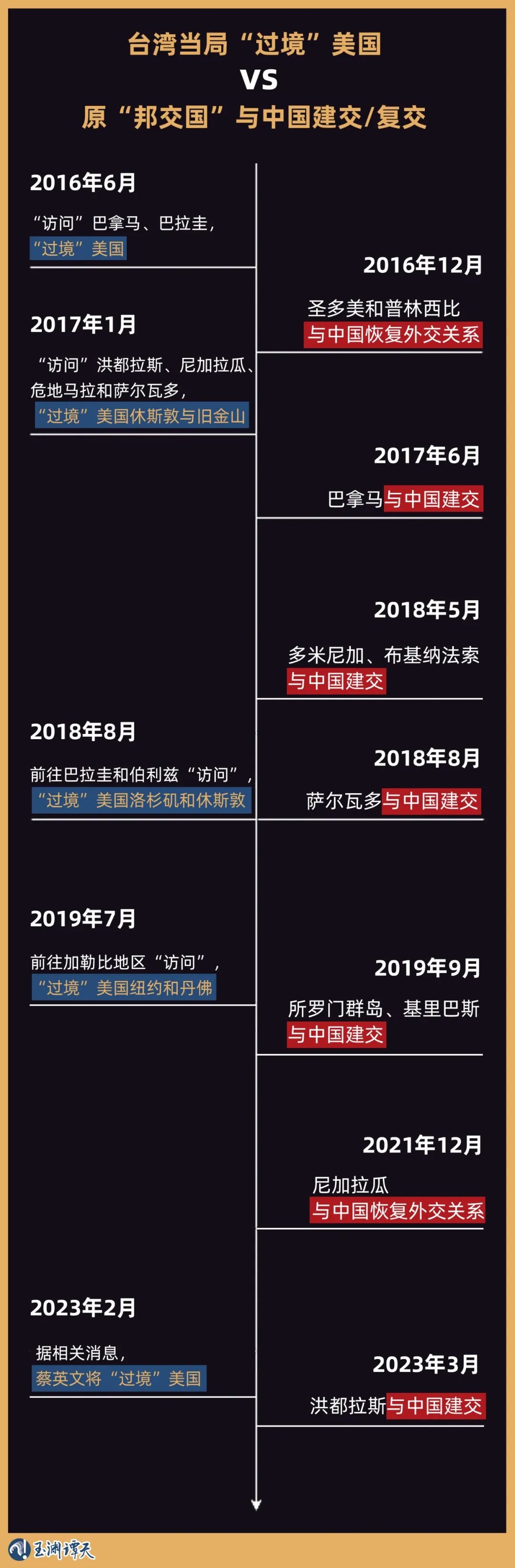 事实上,类似的情况已经不是第一次发生了。把台湾当局“过境”美国和“断交”的时间线结合起来,能够看出明显的规律:“过境”美国的同时,台湾当局的“邦交国”,也在越访越少: