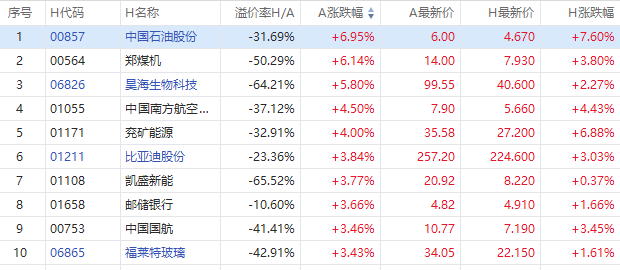 截至发稿,中国石油股份A股涨6.95%,H股现涨7.6%,昊海生物科技A股涨5.8%,H股现涨2.27%,兖矿能源A股涨4%,H股现涨6.88%。