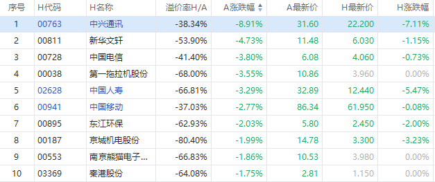 中兴通讯A股跌8.91%,H股现跌7.11%,中国电信A股跌3.8%,H股现跌0.73%,中国人寿A股跌3.29%,H股现跌5.47%。