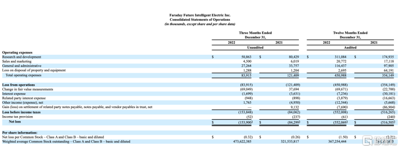 据FF本月初发布财报显示,2022年年度,FF净亏损为5.52亿美元(折合人民币约38.49亿元),而上年同期的净亏损为5.16亿美元。其中,2022年第四季度,FF亏损1.54亿美元,2021年同期三个月的净亏损则8430万美元。
