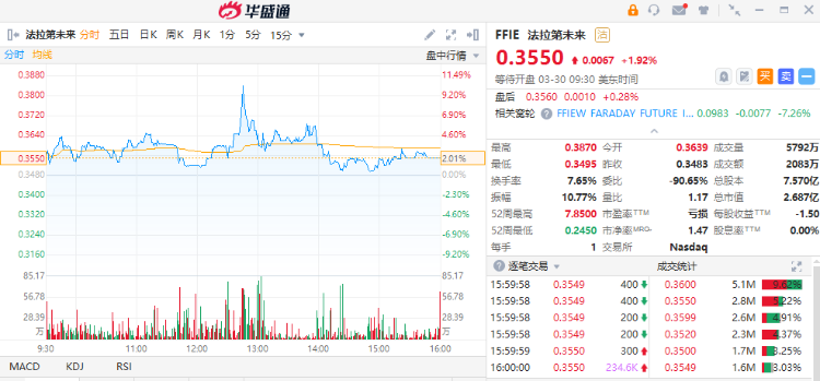 截至当地时间3月29日美股收盘,法拉第未来报0.355美元,涨幅1.92%,市值2.69亿美元。