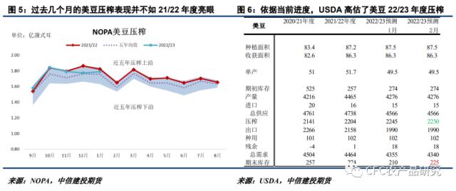 NOPA数据显示,过去几个月的美豆压榨出现同比下滑。2022年9至2023年1月期间,美豆累积压榨8.7827亿蒲式耳,同比上一市场年度同期还小降0.86%,而USDA给的2022/23年度美豆压榨增长预估在1.18%。若后期美豆压榨没有提速,这可能着暗示USDA调降美豆22/23年度压榨预估的可能。近几周在巴西大豆的挤占下,美豆出口出现降速的情况,周度出口净销售呈现显著下行,暂时不支持出口预估的上调。22/23年度美豆49.5的单产预估可能还在10月后具备一定上调空间,可能令该季美豆结转库存稳稳落在2亿蒲式耳以上。