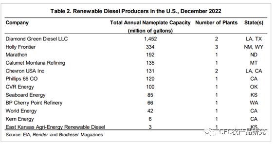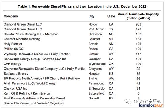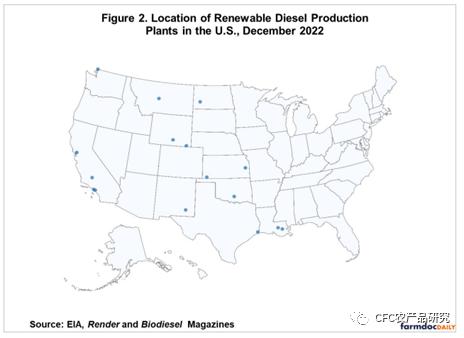 图2:2022年12月美国可再生柴油生产厂商位置分布图;来源FARMDOC