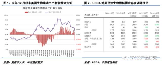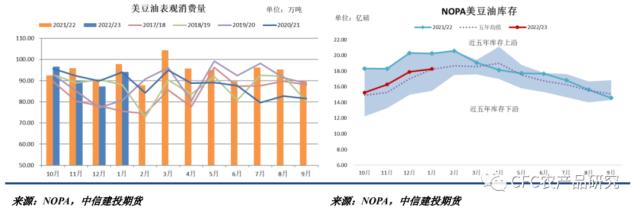 去年12月以来,美国生物柴油生产利润整体走低,至2月底进入亏损状态,这在一定程度抑制了美国生物柴油生产及美豆油投料的积极性。根据EIA数据,2022年10-12月,美豆油生物燃料投料合计27.35亿磅,较上一市场年度同期的25.89亿磅增长5.64%,不及USDA预估的全年度12.1%的增幅。按照全年度5.64%左右的增幅测算,美豆油22/23年度生物燃料需求落在110亿磅左右较为恰当,而这也与我们此前按照EPA的掺混义务要求测算出的需求较为一致,这也意味着当前USDA当前116亿磅的美豆油生物燃料需求预估存在下调空间。