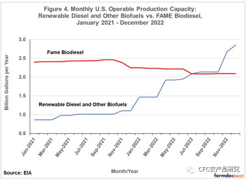 图4显示了2021年1月至2022年12月美国可再生柴油运行能力的可获得数据,以及FAME生物柴油的相同系列数据。可再生柴油的运行能力在2021年徘徊在10亿加仑左右,然后在2022年急剧上升,在2022年12月达到28亿加仑的峰值。有趣的是,2022年12月的运营产能超过了该月的铭牌产能(见图1)。虽然通过让工厂超时运转或使产量高于额定产能,运营产能有可能超过铭牌产能,但考虑到2022年有多少新的可再生柴油产能投产,出现这种情况仍然令人惊讶。就在2022年1月,铭牌产能还超出了运行产能19%。