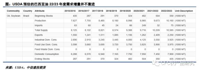 但USDA似乎早已对巴西生柴政策实施的不及预期作了防备。USDA预计2022年10月至2023年9月,巴西豆油工业消费为392.5万吨,同比仅增长37.5万吨,这仅仅对应着巴西22/23年度生柴综合掺混率提高1%。尽管截至当前巴西的豆油消费同比下滑,但即便是巴西生物燃料生产商协会的提案也足以满足这一年度增长需求,目前来看暂无高估。但其实市场较少参考USDA对巴西豆油平衡表的预估,这导致USDA在该领域的指引性并不强。