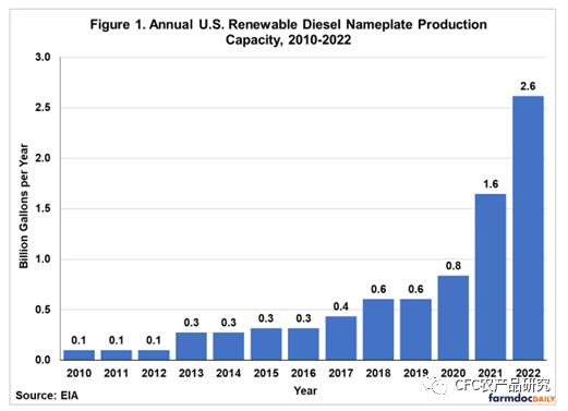 图1:2010-2022年美国可再生柴油总铭牌容量趋势图;来源FARMDOC