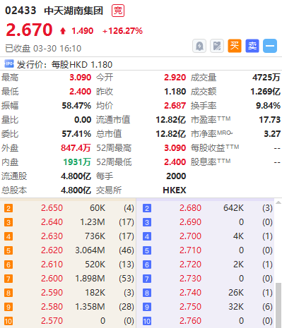 3月30日消息,湖南省总承包建筑集团中天湖南集团(02433)首日挂牌,收报2.67港元,较招股价1.18港元上升1.49港元或126.27%,高位3.09港元,低位2.4港元,成交4724.7万股,涉及金额1.27亿港元。 不计手续费及佣金,一手2000股赚2980港元。