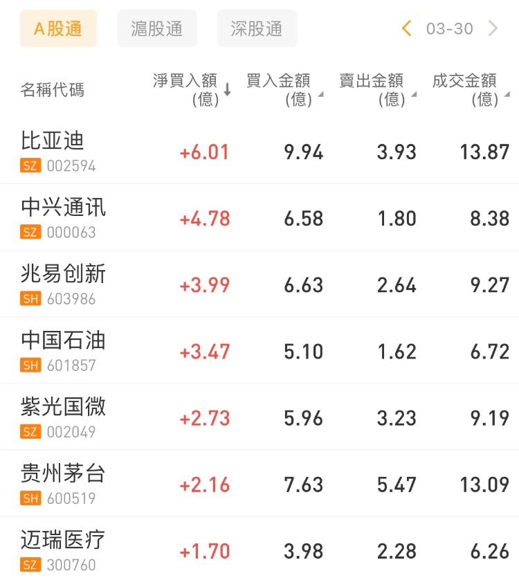 北向资金今日净买入48.07亿元。比亚迪、中兴通讯、兆易创新分别获净买入6.01亿元、4.78亿元、3.99亿元。工业富联净卖出额居首,金额为3.97亿元。