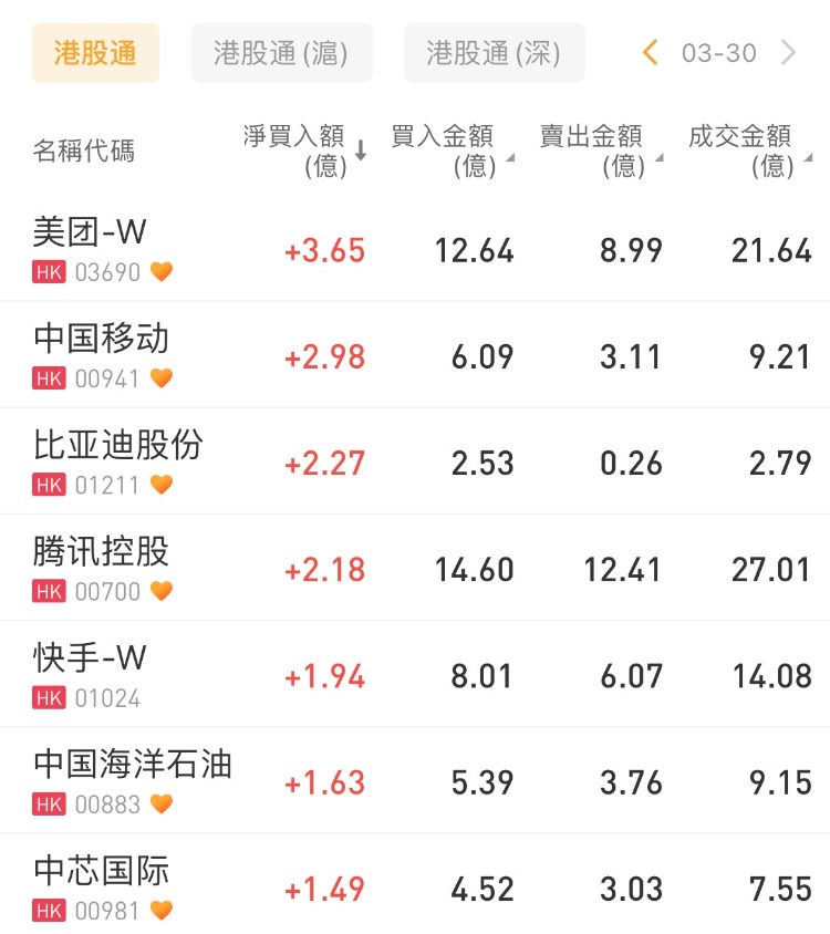 南下资金今日净买入港股20.86亿港元。美团、中国移动、比亚迪股份分别获净买入3.65亿港元、2.98亿港元、2.27亿港元。小鹏汽车净卖出额居首,金额为1.19亿港元。注:南下资金自3月6日迄今已连续19个交易日净买入腾讯,累计超150亿港元。