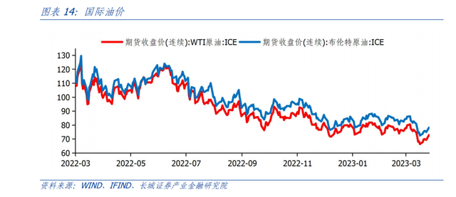三月份,银行业危机引发经济衰退担忧,国际油价大跳水。3月10日前后,美国三家银行相继关闭,之后瑞士信贷、美国第一共和银行、德意志银行也出现问题,银行业危机继续发酵。在这种背景下,欧央行加息50bp,美联储加息25bp,经济衰退的预期进一步增强,3月10日后,国际油价大幅下跌。3月17日,WTI原油期货价66.38美元/桶,较3月初下跌了14.65%,油价跌至2021年底以来新低。3月27日,油价回升至72.94美元/桶。