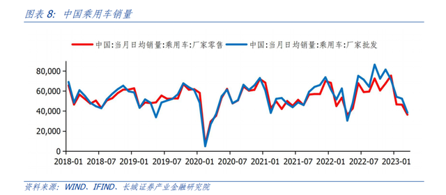 其次,乘用车销量大幅下降,车企降价也未见好转。中国乘用车销量自2022年9月开始回落,2023年疫情放开后也未见起色。一方面,政府免征汽车购置税的政策于2022年底到期,另一方面,疫情期间居民资产负债表受损,消费能力下降。3月初,东风汽车大幅降价,在政企补贴后,部分车型降价最高多达9万。之后,特斯拉、比亚迪、奥迪、奔驰等40多家车企都卷入降价潮。但3月份,国内汽车销量还是不及预期。
