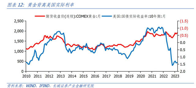 黄金可能正在酝酿大牛市。在之前的报告里我们一直强调黄金已经脱离了锚:美国实际利率。截至目前这一背离现象还在加剧。究其原因一方面是美国经济结构问题,实际利率的回升对经济的抑制作用已经大幅打折;另一方面是地缘政治格局发生巨大变化,安全需求极度上升造成黄金需求大幅上升。