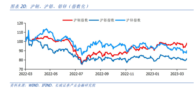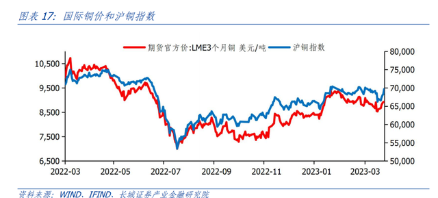 三月份,国际铜价先跌后涨,呈现“V”形走势。在海外银行业危机发生后,风险偏好下降,大宗商品普遍下跌,LME铜3月16日跌至8536美元/吨。美联储提供流动性支持,暂时稳住风险,铜价出现反弹。但从全年来看,中国经济已经从年初的强复苏逐渐趋向于平稳,美国经济可能出现深度衰退,全球铜需求前景偏向下行。而铜产量增速偏向上行,我们认为,2023年精炼铜供给过剩将会导致铜价下跌。