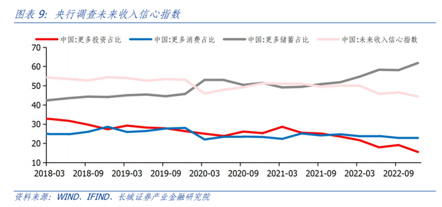 最后,居民资产负债表受损,影响消费意愿,修复仍需时间。根据央行调查,2022年居民对于未来收入信心指数下降,同时选择更多储蓄的比例明显上升,而更多投资的占比明显下降,更多消费的占比小幅下降。消费复苏不仅依靠政策刺激,也还需要居民对于收入信心的恢复和家庭资产负债结构的修复。中国的疫后红利期可能比海外持续得更为短暂,经济从前两个月的强复苏逐渐趋于平稳。
