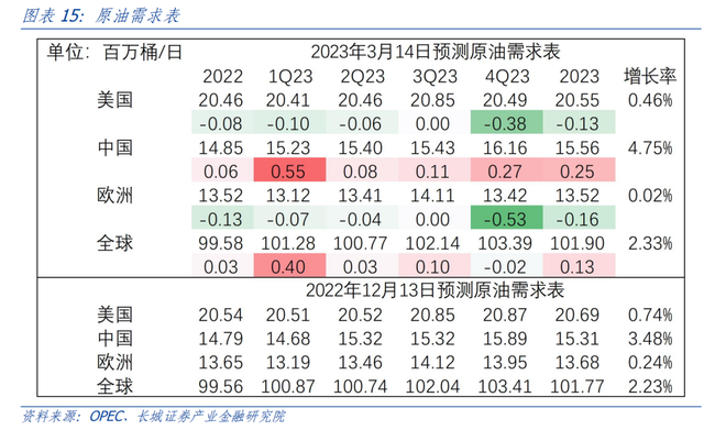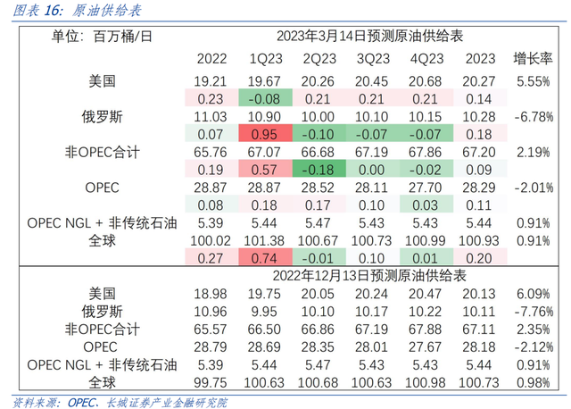从需求角度,欧美需求量减少,中国需求量大增。中美欧原油需求占全球的50%左右。中国放开疫情防控后,2023年原油需求明显增长,尤其是一季度,较上一次预测增加了55万桶/日。美国经济即将衰退,全年原油需求减少了12万桶/日,四季度缩减最多,但我们预期美国经济衰退顶峰可能在三季度,其原油需求可能比OPEC预测更低。欧洲需求量变化基本和美国一样,只是下降幅度更大。从全球角度,在中国的强劲带动下,2023年需求增长了13万桶/日,但中国的需求很大程度上会被俄罗斯供应,难以拉升国际油价。