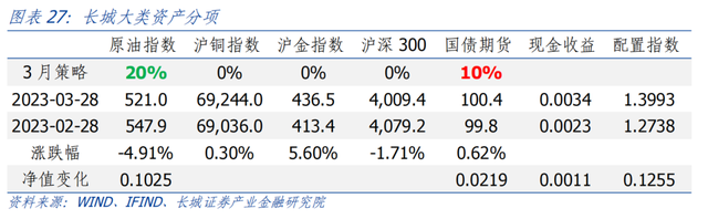 三月份长城大类资产配置指数从2月28日的127.38上升至3月28日的139.93。在三月配置策略中,我们预判了油价下行,上调了原油空单头寸,大类资产配置指数创在3月20日创年内新高155.52。截止28日,原油指数下跌4.91%,拉高大类资产指数10.25个百分点。十年期国债期货(T2306)上涨0.62%,拉高大类资产配置指数2.19个百分点。
