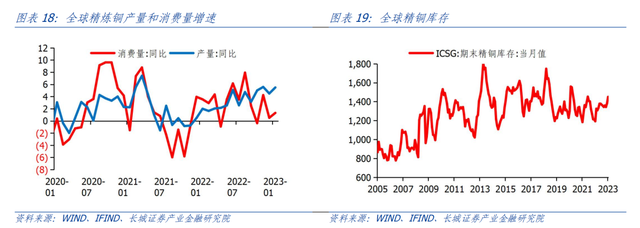 产量增速继续提升,供给上升或将推动铜价下行。根据ICSG数据,2023年1月,全球精炼铜产量同比增速5.5%,前值4.5%,维持在较高增速,而消费量同比增速1.3%,低于产量增速。1月份全球精炼铜产量226.7万吨,消费量216.4万吨,供给过剩10.3万吨。从库存来看,全球精铜库存自2022年1月就开始回升,2023年1月精铜库存145万吨,同比增长21.6%,并不存在市场所担忧的“库存见底”风险。