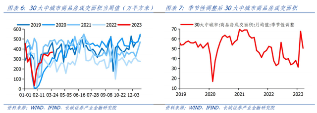 中国疫后需求释放的红利基本结束,经济进入平稳复苏。首先,房地产市场较前两月出现降温迹象。在放开疫情防控后,积压的购房需求开始集中释放,2月份商品房成交面积明显增长。但是,截止3月26日,3月份30大中城市商品房日均成交面积低于2019年和2021年同期,高于受疫情影响严重的2020年和2022年同期。经季节性调整后,3月商品房成交面积明显下降。