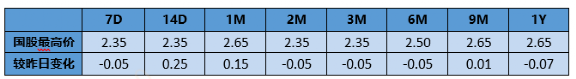 今日NCD交投情绪一般,受资金收紧影响,6m内存单收益略有上行,9m以上期限收益整体窄幅波动。具体来看,6月到期2.50;7月到期2.54;9月到期2.54;12月到期2.575;明年1月到期2.645;今日银行间短券交投情绪一般,1M内短券价格上行10BP左右,更长期限短券价格基本持平。整体需求略较弱,买盘较少。买盘银行、理财、基金等。