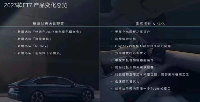 另一款车型预计为近日曝光的2023款ET7。根据此前曝光的文件来看,新车在付费选装项目上新增曙光金配色、拖挂套装、N-Box和前风挡下沿加热。此外,其还对无线充电功率、座椅体验、方向盘拨杆造型、低速提示音进行优化,并且提供Haptex内饰搭配超纤合成皮方向盘、中控增加镀铬圈装饰、门板下侧软包覆、门板储物盒水杯限位器、底部植绒工艺以及前排扶手箱内新增一个Type-C接口。