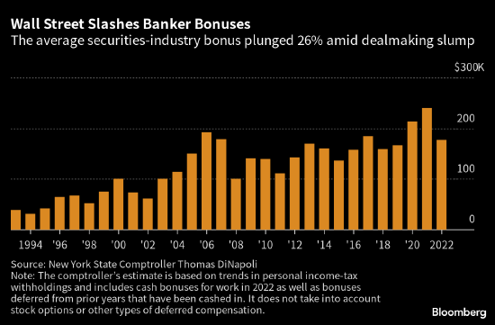 根据纽约州主计长Thomas DiNapoli的分析,去年全行业奖金池降至了337亿美元,比2021年下降21%。这意味着纽约证券行业一般员工的奖金降至了176,700美元,为2019年以来的最低水平。