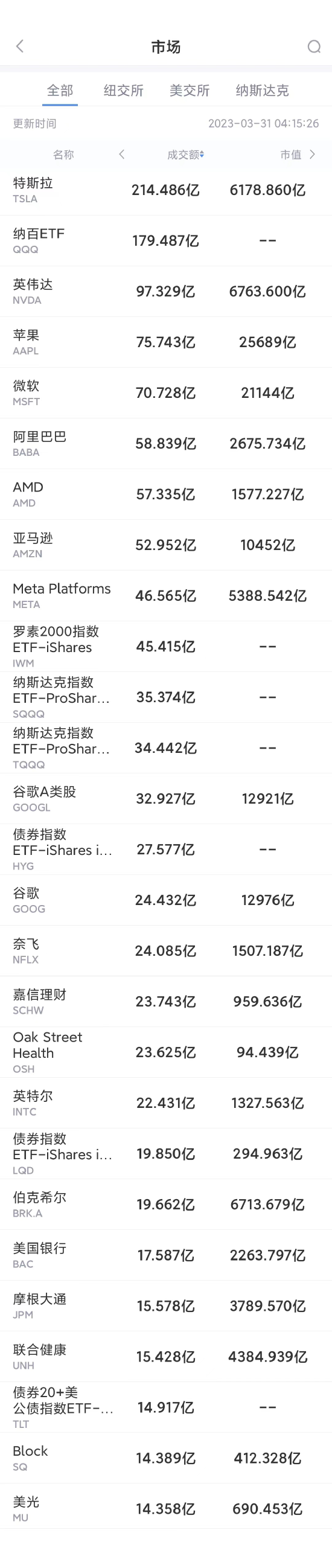 以下为美股当日交易最活跃的20只股票(按成交额):
