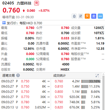 华盛资讯3月31日讯,跨境数字营销服务提供商力盟科技首日涨8.57%,现报0.76港元每股,一手账面浮盈240港元。盘前成交额1073万,最新总市值6.08亿港元,该股昨日暗盘收涨15.71%。