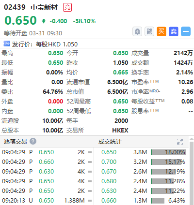 生物降解塑料产品制造商中宝新材首挂跌38.1%,现报0.65港元每股,一手账面蚀800港元。盘前成交额1424万,最新总市值6.5亿港元,该股昨日暗盘收跌40.95%。