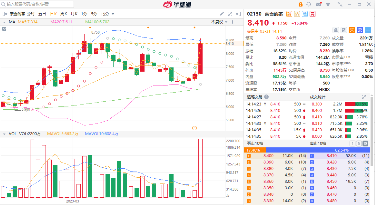 3月31日,奈雪的茶绩后拉升大涨,截至发稿,现报8.41港元涨15.84%,成交额1.81亿港元。