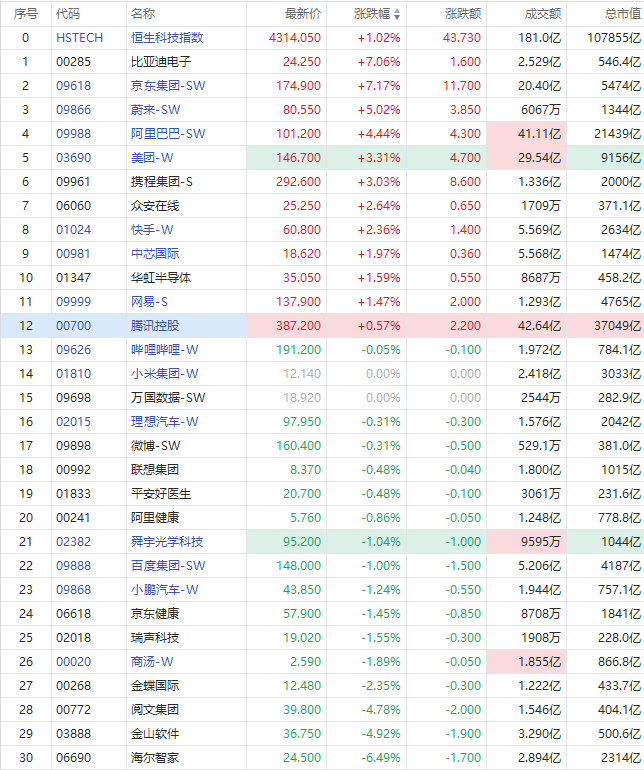 科网股多数走强,京东集团-SW涨7.17%报174.9港元每股,成交额20.4亿港元,公司拟分拆京东工业、京东产发于港交所上市;阿里巴巴-SW涨4.44%报101.2港元,两周涨幅近25%;美团-W涨超3%,快手涨2.36%,网易-S跟涨,腾讯微涨0.57%;哔哩哔哩-W微跌,百度集团-SW跌逾1%。