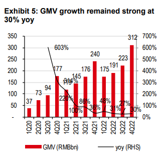 2022年第四季度,快手电商交易总额(GMV)为3124亿元,较去年同期的2403亿元增长30%,同时创下单季GMV历史新高。
